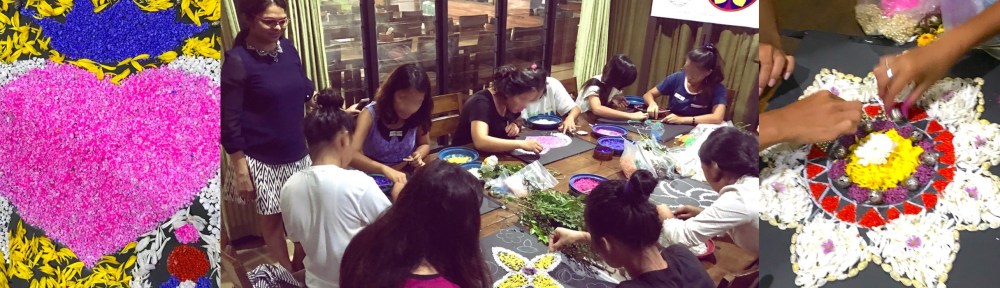 Materials: flowers, beads, shells, pebbles, rangoli coloured powder