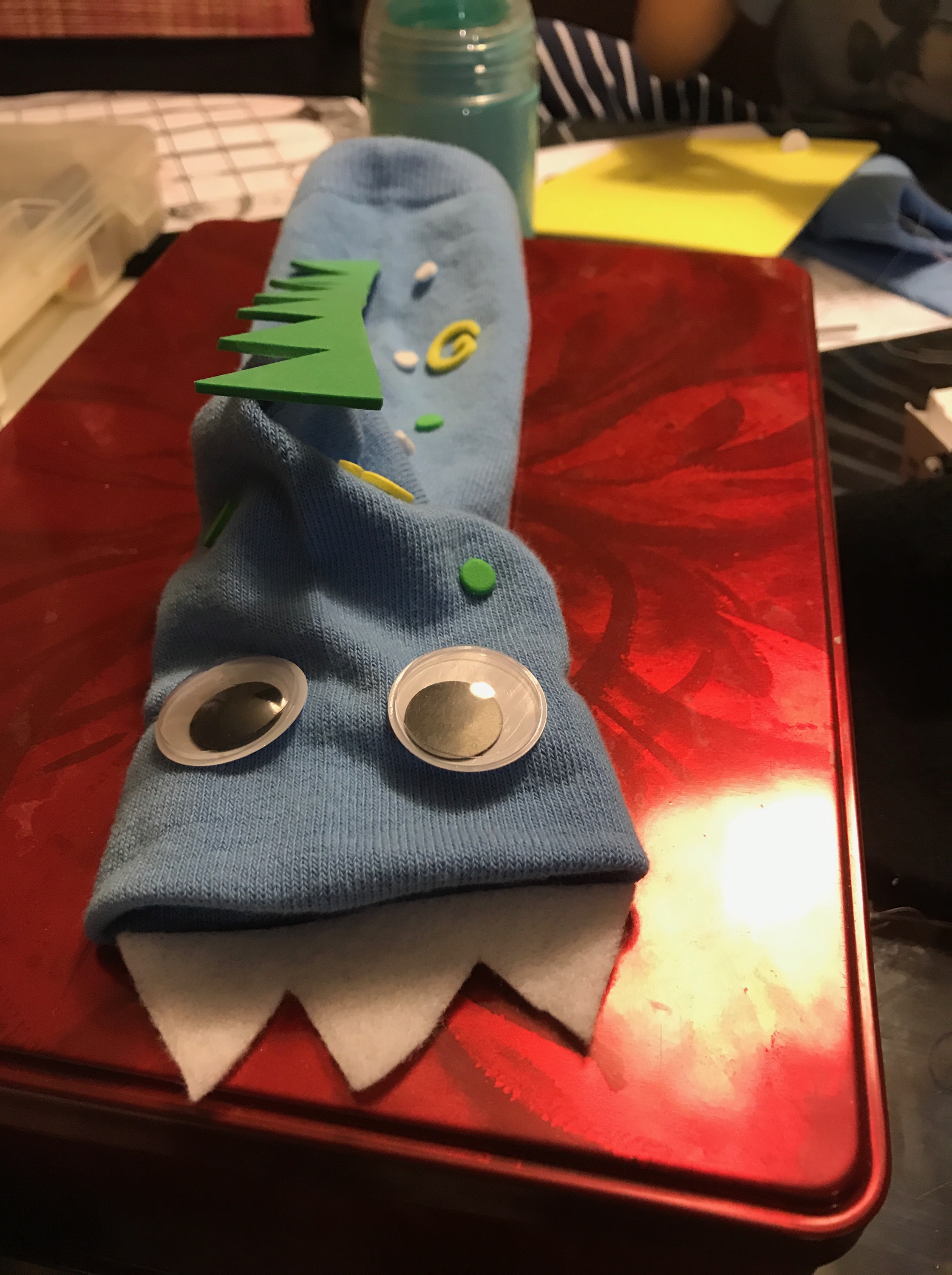 IMG_3827.JPG Published February 23, 2018 at 2240 × 3000 in Dino Sock Puppet Workshop Embellish your Dino with felt, foam, gems, etc. Adhere using heat glue gun.